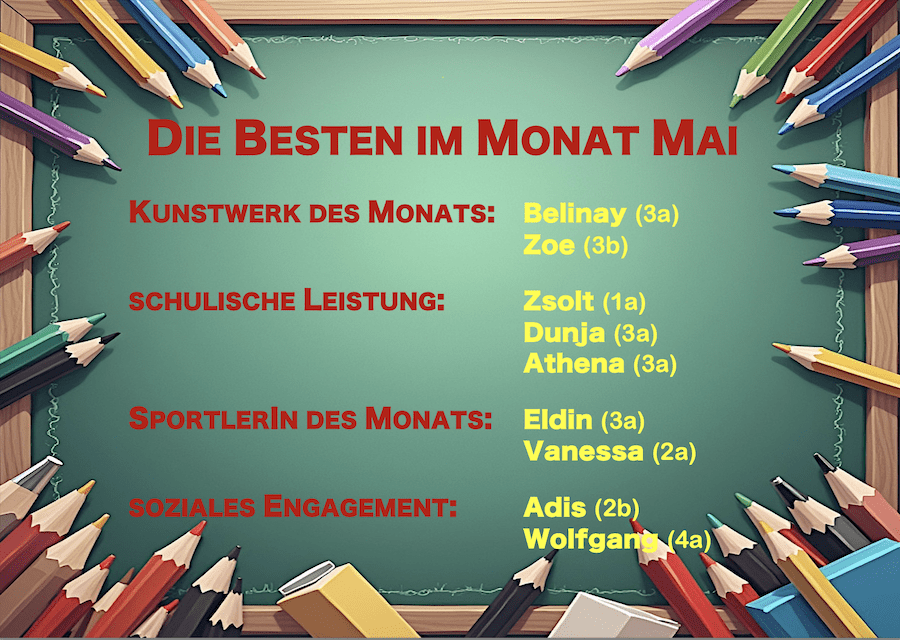 Für das Schuljahr 2024/25 haben wir uns ein neues Projekt vorgenommen, bei dem wir Schülerinnen und Schüler, die positiv im Schulalltag auffallen (durch ein tolles Sozialverhalten oder mit schönen Werkstücken bzw. Zeichnungen usw.) vor den „Vorhang“ holen. Es werden in jedem Monat die Besten gekürt und auch auf der Homepage und auf einer digitalen Infotafel in der Schule präsentiert.